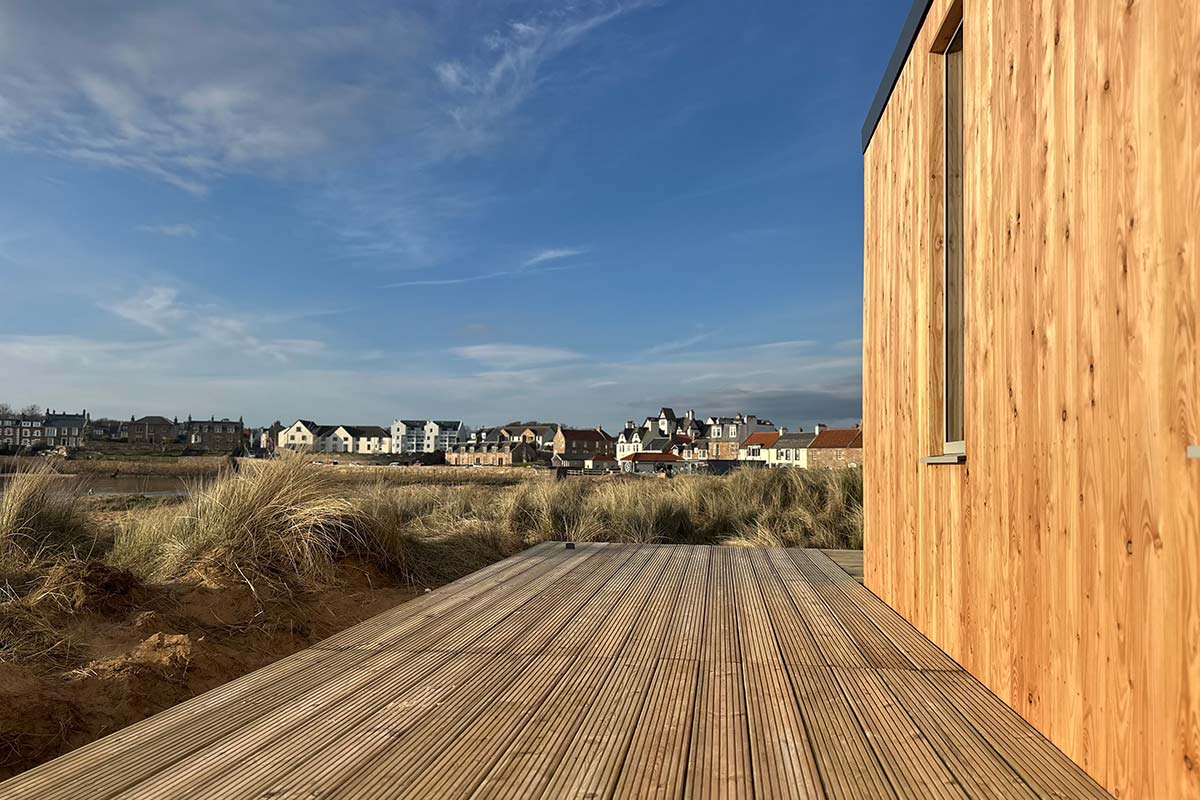 The Harbourmaster’s interior is built from British thermal treated Poplar and Ash, rather than Nordic-grown timber, or cedar that is shipped across The Atlantic Ocean. The Harbourmaster’s exterior is built from sustainably grown larch from the Scottish Borders.